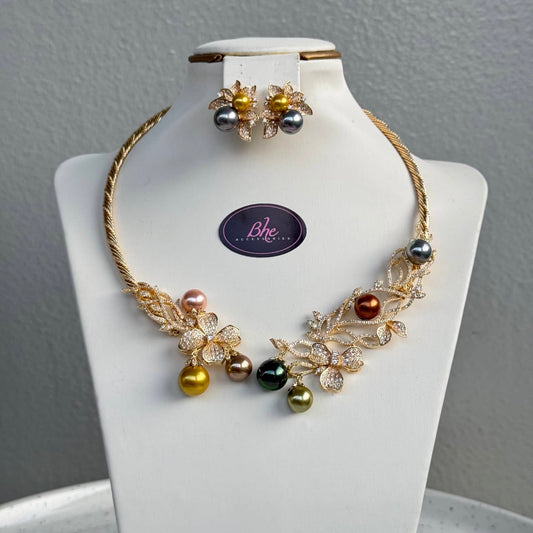 Luxury Statement 2-Piece Multicolour Pearl Cubic Zirconia Jewelry Set – Gold