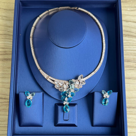 Luxury Statement Cubic Zirconia Drop Necklace and Earring Set - Turquoise Blue