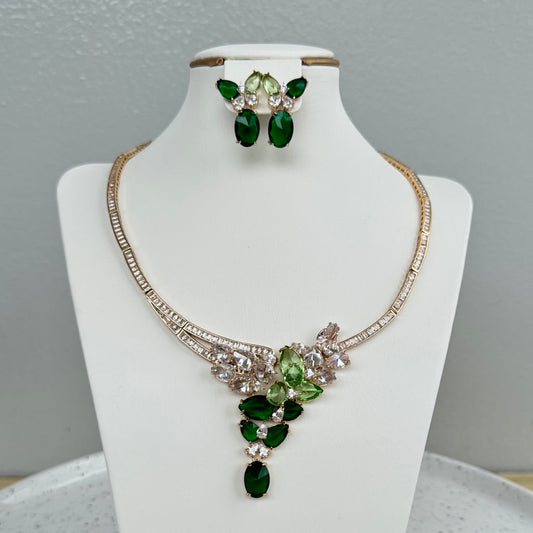 Gold Tone Floral Cubic Zirconia Necklace and Earring Jewelry Set - Green