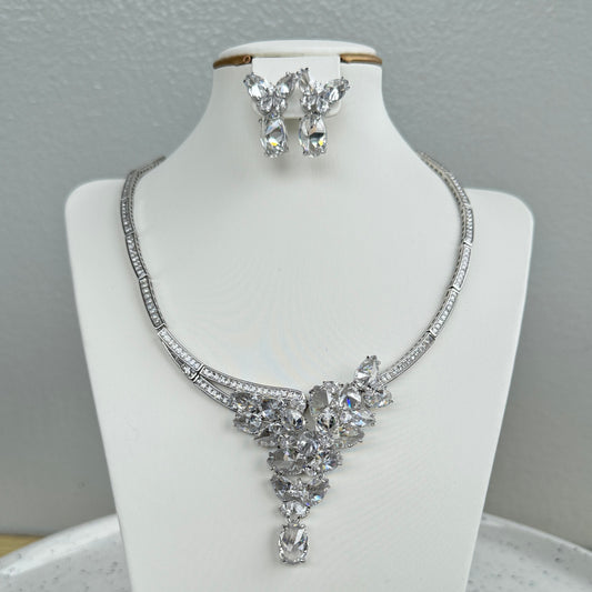 Luxury Statement Cubic Zirconia Drop Necklace and Earring Set - Silver
