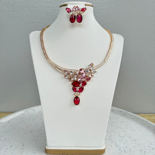 Luxury Statement Cubic Zirconia Drop Necklace and Earring Set - Pink