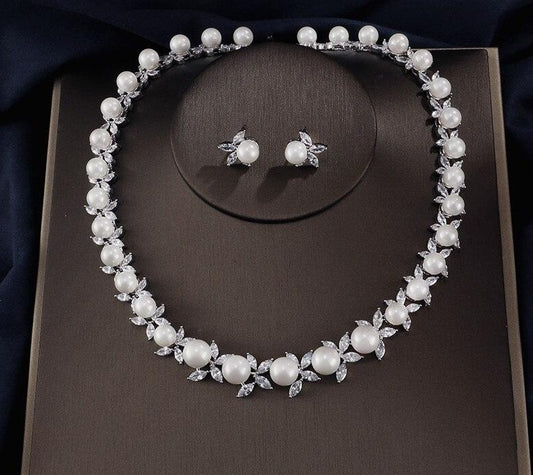 Pearl Round Cubic Zirconia Necklace and Earrings Jewelry Set