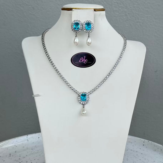 Pearl Drop Pendant Necklace and Earring Cubic Zirconia Jewelry Set - Turquoise