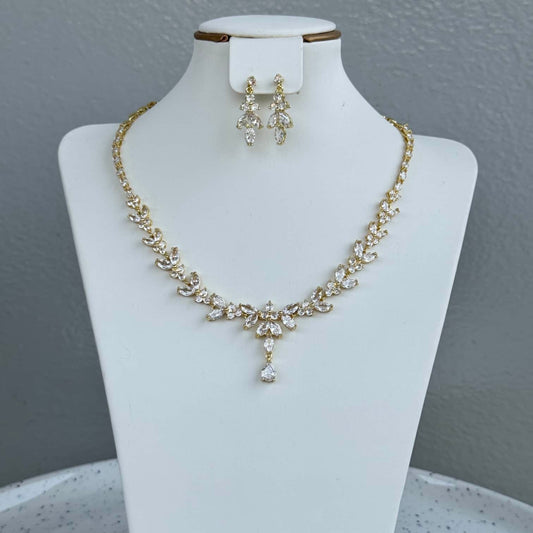 Gold Plated Long Pendant Cubic Zirconia Necklace and Earring Jewelry Set