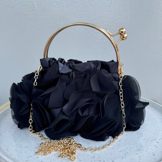 Satin Ruffle Detail Kiss Lock Clutch Bag - Black