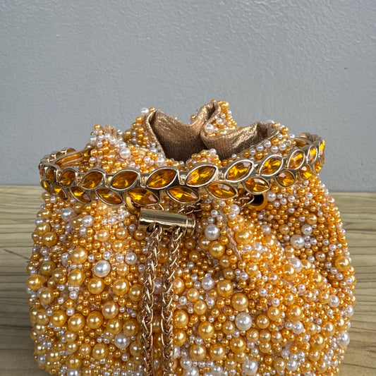 Beaded Ring Handle Rhinestone Drawstring Bucket Clutch Bag