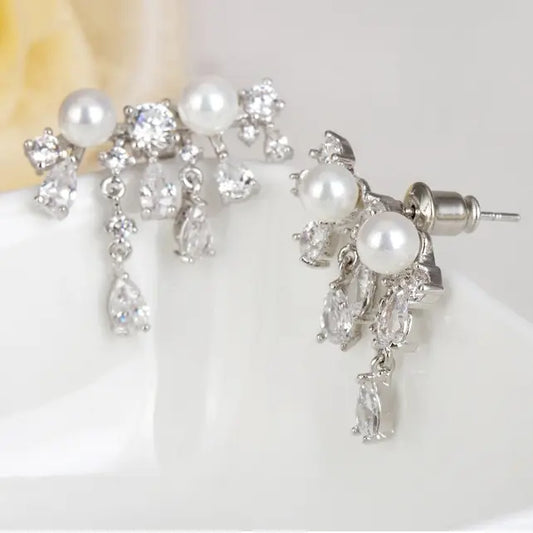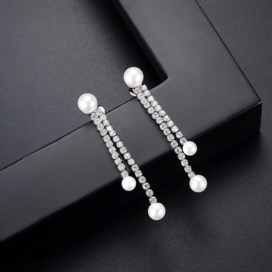 Pearl Cubic Zirconia Tennis Drop Bridal Earrings